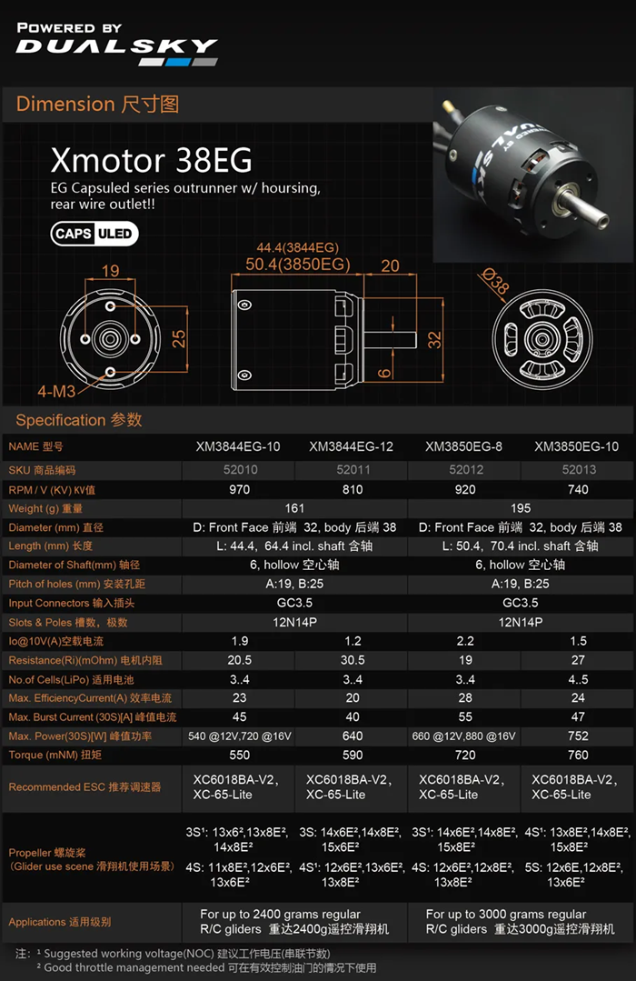 The Dualsky XM series motors are high-performance brushless outrunner motors designed specifically for RC aircraft and drones. These motors are known for their precision engineering, providing excellent power-to-weight ratios, efficiency, and durability. The XM series features a variety of sizes and KV ratings, allowing users to select the ideal motor for their specific application, whether it's for lightweight indoor flyers, high-speed racing drones, or larger, more powerful aircraft. With robust construction and advanced cooling designs, the Dualsky XM motors are trusted for their consistent performance and reliability in demanding conditions.