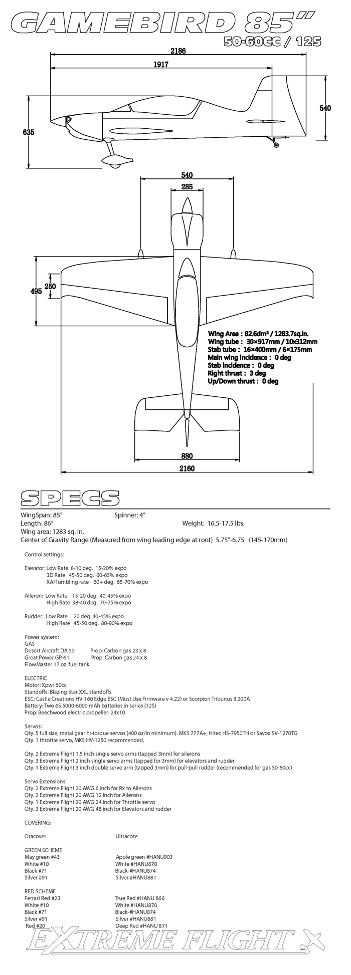 Introducing the brand new officially licensed Extreme Flight RC 85 inch GB1 Gamebird EXP ARF! The full scale Game Composites GB1 Gamebird was designed by Philipp Steinbach. It is an ultra-modern all carbon fiber composite construction aerobatic masterpiece with gorgeous flowing lines and truly amazing performance capabilities. We were given Philipp's blessings to model his Gamebird and allowed access to his CAD and 3D drawings of the GB1 which allowed us to recreate the unique styling of this aircraft while tweaking it ever so slightly to achieve the performance capabilities of our other current EXP models. The result is a beautiful model aircraft with outstanding 3D, Precision and XA flight capabilities that pays tribute to this modern aerobatic wonder. Thank you Philipp!