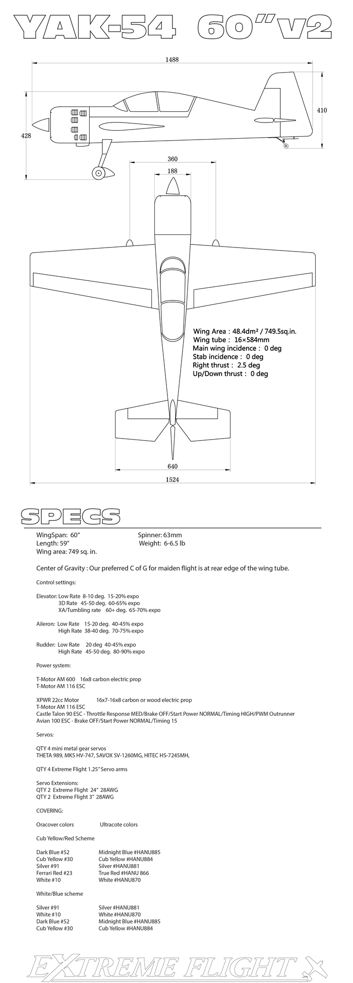 The 60" Yak 54 V2 builds on the stellar reputation of the original version with updated composite G10/plywood and carbon construction resulting in a lighter, stronger airframe. . The Yak-54 airframe is famous for precision, low coupling, and easy post-stall performance. This V2 ups its game with stiffer, stronger airframe design for better XA and precision.