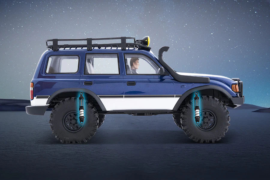 Offiziell von Toyota lizenziert, zeigt die Karosserie bemerkenswerte maßstabsgetreue Details sowohl innen als auch außen: Schnorchel, Dachgepäckträger, Scheibenwischer, Stoßstangen, Leiter, Fahrerfigur, Armaturenbrett und Lenkrad. Die zweifarbig lackierte PC-Schale mit Metallic-Flake bietet Langlebigkeit und ein erstklassiges Aussehen.
