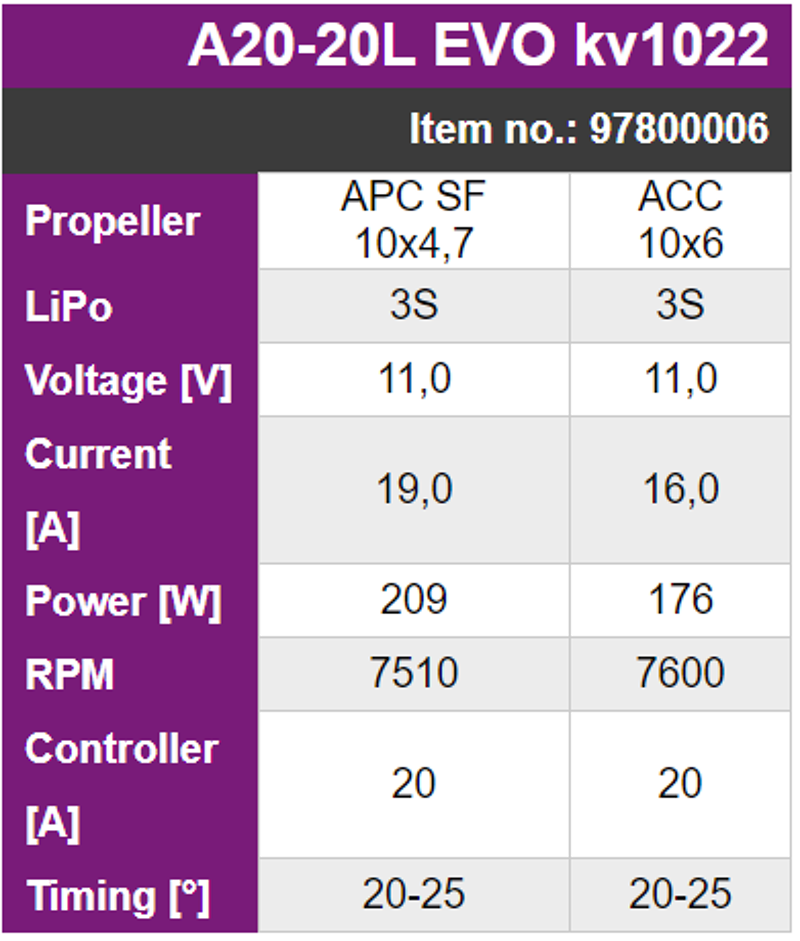 The weight-optimised high-end motor A20-20L EVO kv1022 with a weight of only 55g is ideal for 3D models up to 550 and gliders up to 900g.