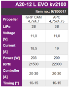 The weight-optimised high-end motor A20-12 L EVO kv2100 with a weight of only 55g is ideal for small light speed models.