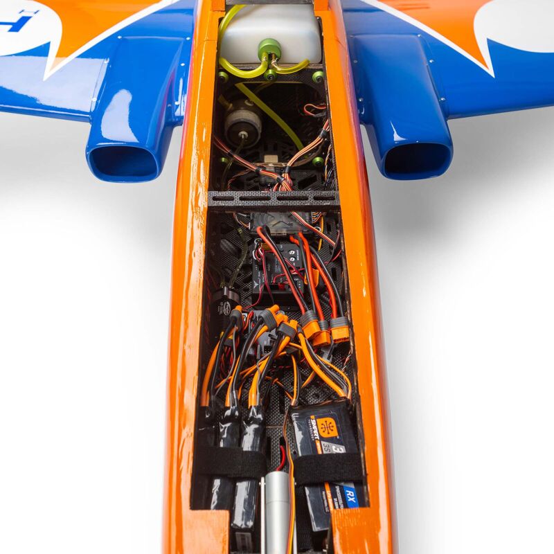 The convenient hatches are large for easy access to vital components such as the electronics and batteries. The two-piece plug-in wing makes this large airplane easy to transport and assemble with minimal fuss so you can arrive at the field and be in the air quickly