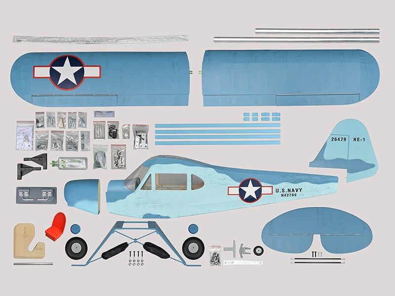 The model is made in an extremely light and high-strength balsa/plywood construction. The laser-cut construction impresses with an extremely high degree of prefabrication, which means that the construction effort is reduced almost to the installation of the drive and electronics. There is plenty of space under the removable canopy for installing the electronics. The Piper is completely covered with printed film.