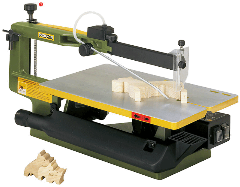 Large saw table made of die-cast aluminium (400 x 250mm). For easier saw blade replacement, it can be unlocked and pushed back (see description at top right). Regular scroll saw blades are fastened by saw blade holders with high clamping force: This ensures true alignment in the saw arm! The machine has also been prepared for saw blades with pin ends that are used without blade holders. Extremely important for these types of scroll saws: A handy adjusting knob enables sensitive clamping of the saw blades!