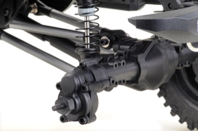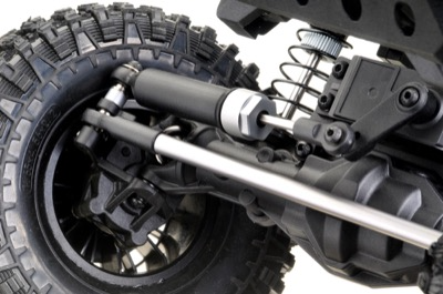 The steering shock absorber absorbs most hard impacts so that the 9kg MG steering servo and the servo arm are spared. Hardened steel drive shafts and a steering angle of 45.8° offer the best possibilities for every terrain. Added to this are the 2.2" tyres, which not only look stylish, but also offer extremely good Grip thanks to the super-soft tyres.