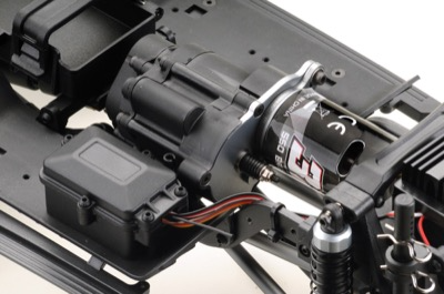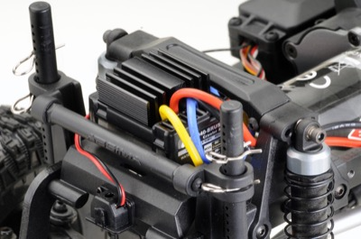 The vehicle comes as standard with a 550 32T brushed high torque motor and a HobbyWing 40A speed controller. You can use "jumpers" on the speed control to determine whether the vehicle will be powered by a 7.2V NiMH battery or a 2S or 3S (low profile) LiPo battery!.