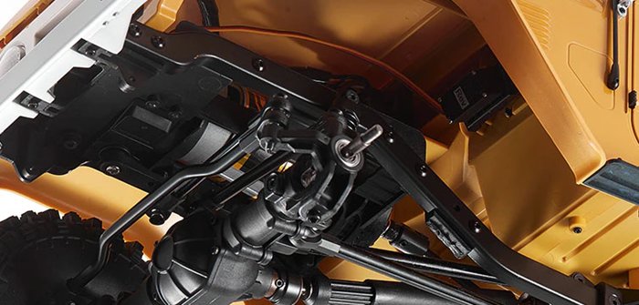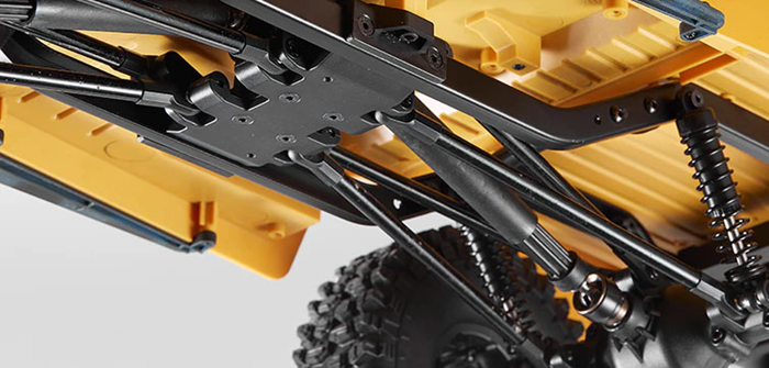 1.9" climbing tires allow for good grip on all terrains. The four-link suspension system ensures a larger shock absorber stroke and better passability. Metal trapezoidal beams provide a solid supportive structure. Even with the ABS hard body and full interior, the vehicle can easily overcome extreme road conditions.