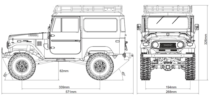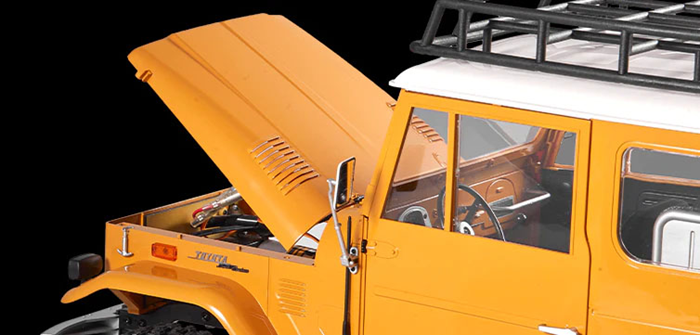 This 1/10 remote control climbing vehicle FJ40 presented by FMS uses an ABS hard body to accurately restore the shape and details of the real vehicle. The left and right doors can be opened, and the door hinge adopts the same metal hinge structure as the real car. The roof can be removed and transformed into a compact pick-up. The hood can be opened, and hidden below are the 35T 550 motor, high-quality brushed ESC and receiver.