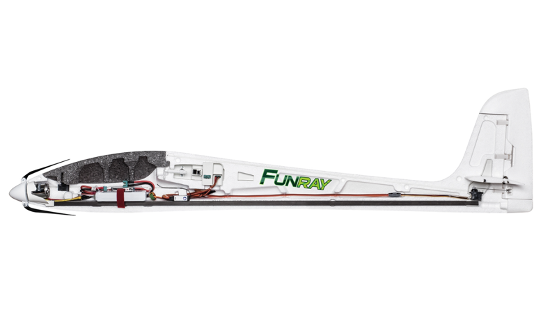 The kit model of this elegant 4-flap electric glider inspires dynamic gliding aerobatics. The FUNRAY has excellent all-round properties, proves itself equally well on slopes and in thermals. After a steep descent with Butterfly, precise landing is child's play. The FUNRAY impresses with unbelievable speed and precision in aerobatic maneuvers. There has never been anything like this with the ELAPOR® glider models! This performance is made possible by its modern hybrid construction made of carbon fiber, stainless steel, aluminum, plastic and the special ELAPOR® construction foam. For this FUNRAY KIT we recommend the perfectly adapted FunRay drive set (# 1-00103), the HITEC ServoSet with cable set M6/UNI (# 1-00113) and the ROXXY EVO LiPo 3 - 3200M 30C flight battery (#1-00482) for optimal performance.
