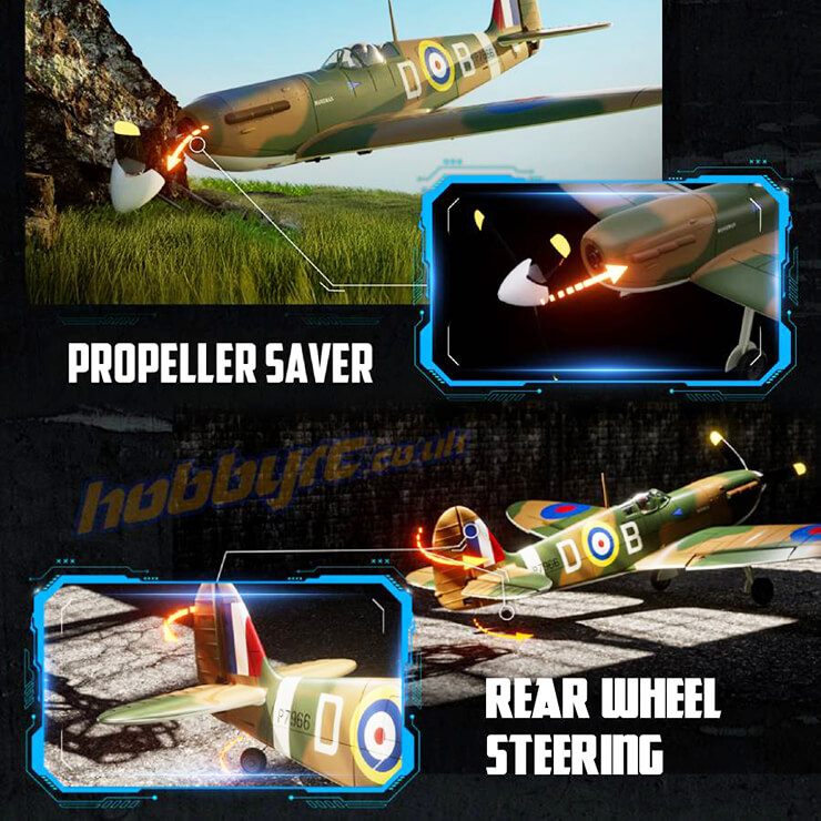 The Spitfire MKII combines authentic wartime aesthetics with high-performance RC features. Its durable FLEEX foam airframe ensures strength and realism, while the brushless motor and 40A ESC provide powerful, reliable flight. Complete with a realistic canopy, scale cockpit, wartime livery, and LED navigation lights, this model is equally at home as a collector’s piece or a capable park flyer.