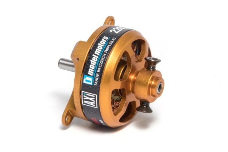 New very light and powerful motor AXI 2203/RACE SAVER GOLD LINE V2 with shaft, these motors have integrated prop adapter and three-point mounting lugs reach just 19 g in weight. This motor was tuned by Gernot Bruckmann especially for area of fast indoor aerobatic models. Three-point mounting lugs allowseasy mounting to the fuselage of model and fast centering of motor. 3,17mm best quality hollow shaft is supported by two ball bearings. This motor is suitable particularly for light AIR RACE and fast aerobatic indoor models up to 170g in weight.
