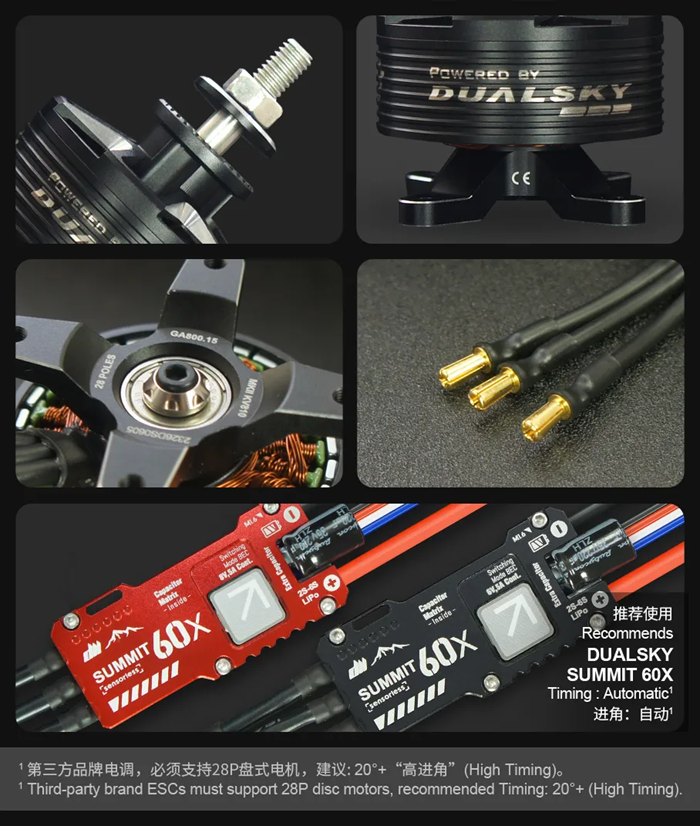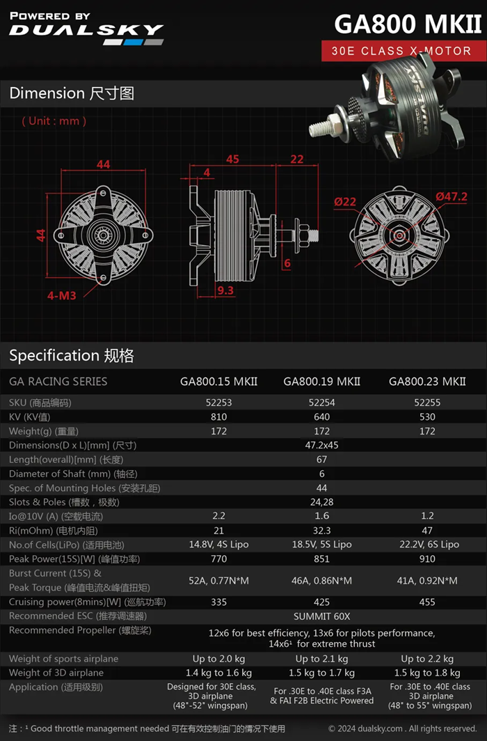 The Dualsky GA series motors are advanced, high-torque brushless outrunner motors designed for large-scale RC aircraft. These motors are engineered for maximum efficiency and power, making them ideal for applications requiring significant thrust and reliability. The GA series is characterized by its robust construction, smooth operation, and exceptional cooling capabilities, ensuring optimal performance even under heavy loads. Suitable for demanding RC setups, the Dualsky GA motors are a popular choice for serious hobbyists and professionals looking to power large planes or heavy-lift drones.