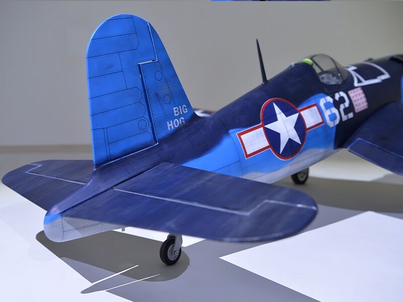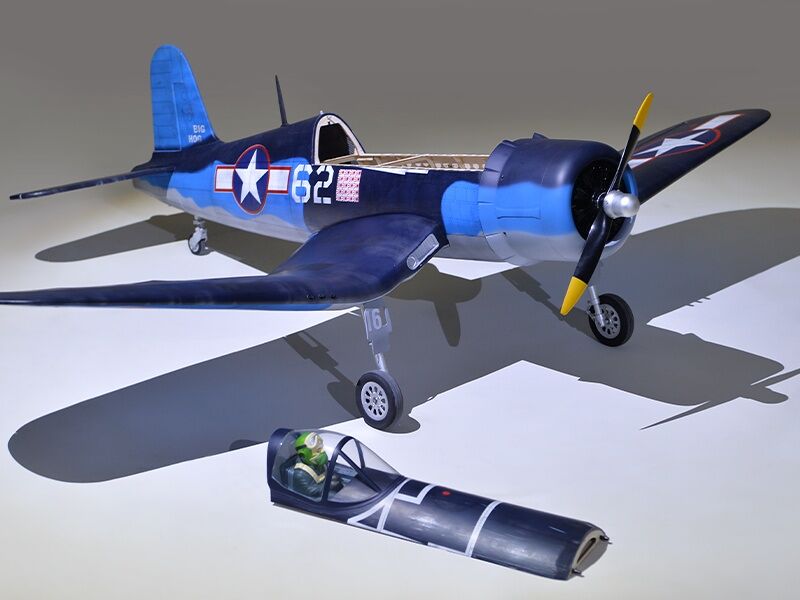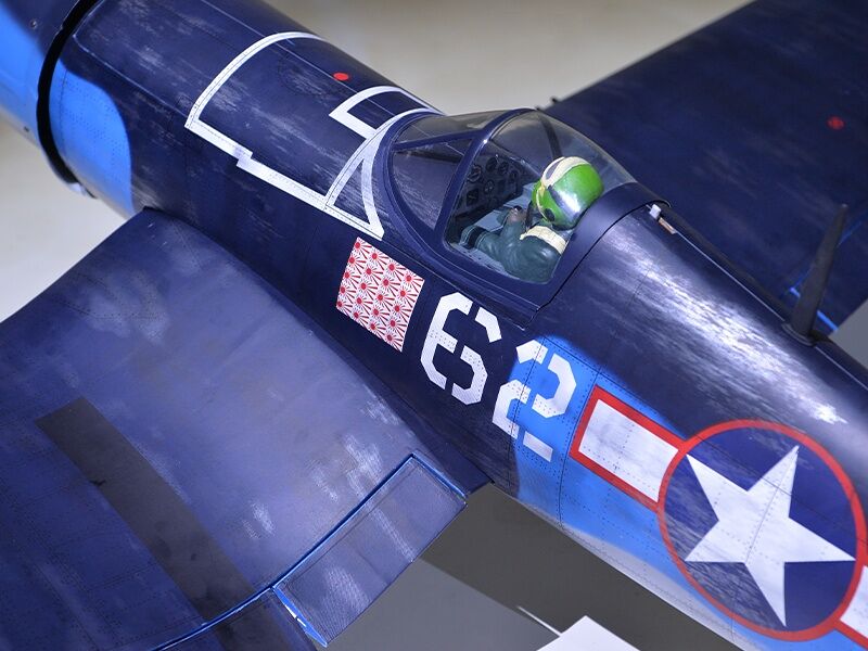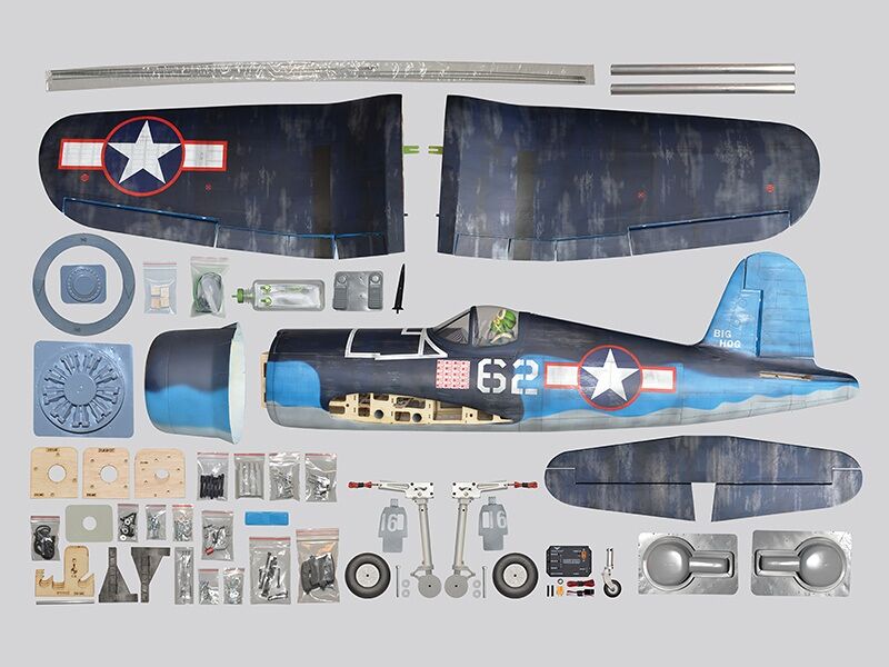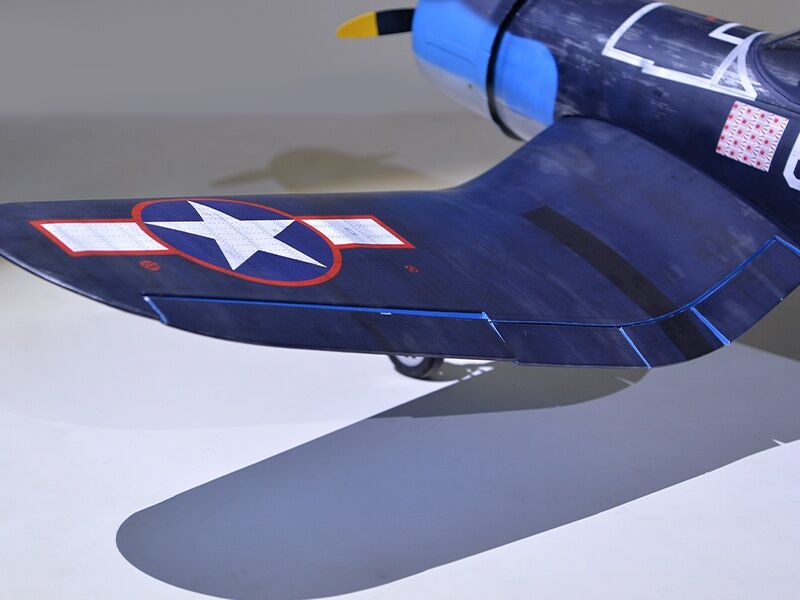 The model is made in an extremely light and high-strength balsa/plywood construction. The laser-cut construction impresses with an extremely high degree of prefabrication, which means that the construction effort is reduced almost to the installation of the drive and electronics. There is plenty of space under the removable canopy for installing the electronics. The Corsair is completely covered with foil.