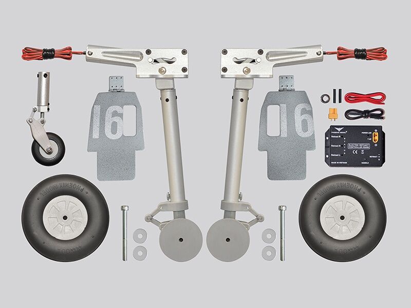 The model comes with an electrically retractable main landing gear and a spring-loaded nose gear. The landing gear legs are made entirely of CNC-milled metal.