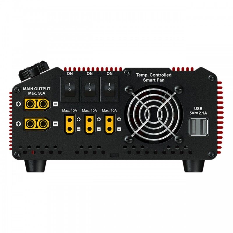 One main DC power output, up to 50 Amperes, three outputs (up to 10 Amperes each) with ON/OFF switch. 1200W output gives you all the power you need to run your high-powered application, or use multiple chargers simultaneously with three sets of integrated banana plug outputs! - Adjustable Output