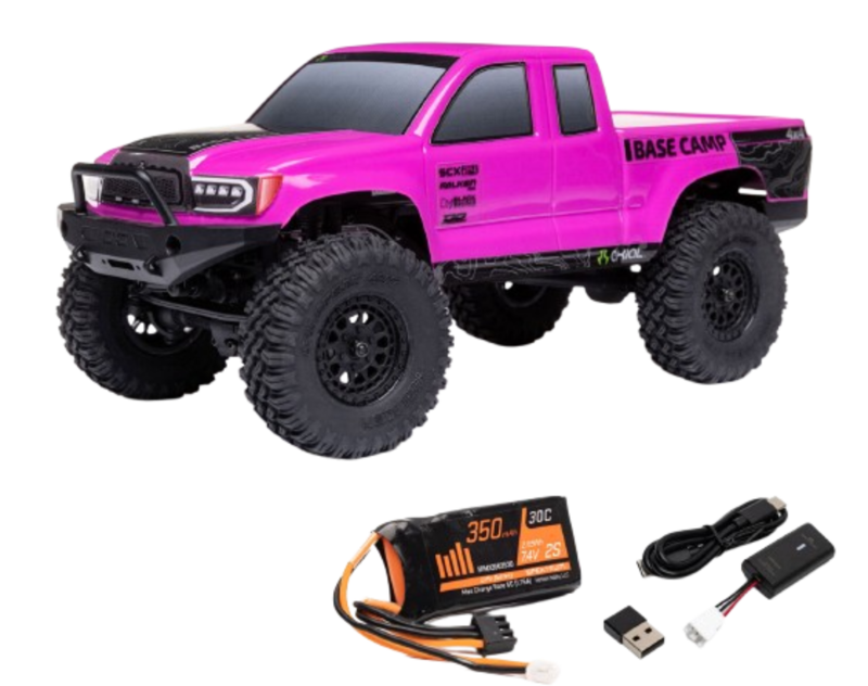 One of the most successful micro platforms of all time, the Axial SCX24 is also one of the best values in the RC crawling hobby. Inside the box, along with the assembled and finished rig, you'll find a Spektrum SLT2 2.4GHz transmitter, 350mAh LiPo battery, and handy USB charger. Even the AA transmitter batteries are included. For big adventures in micro RC crawling — at a small price — come to the SCX24 Base Camp!