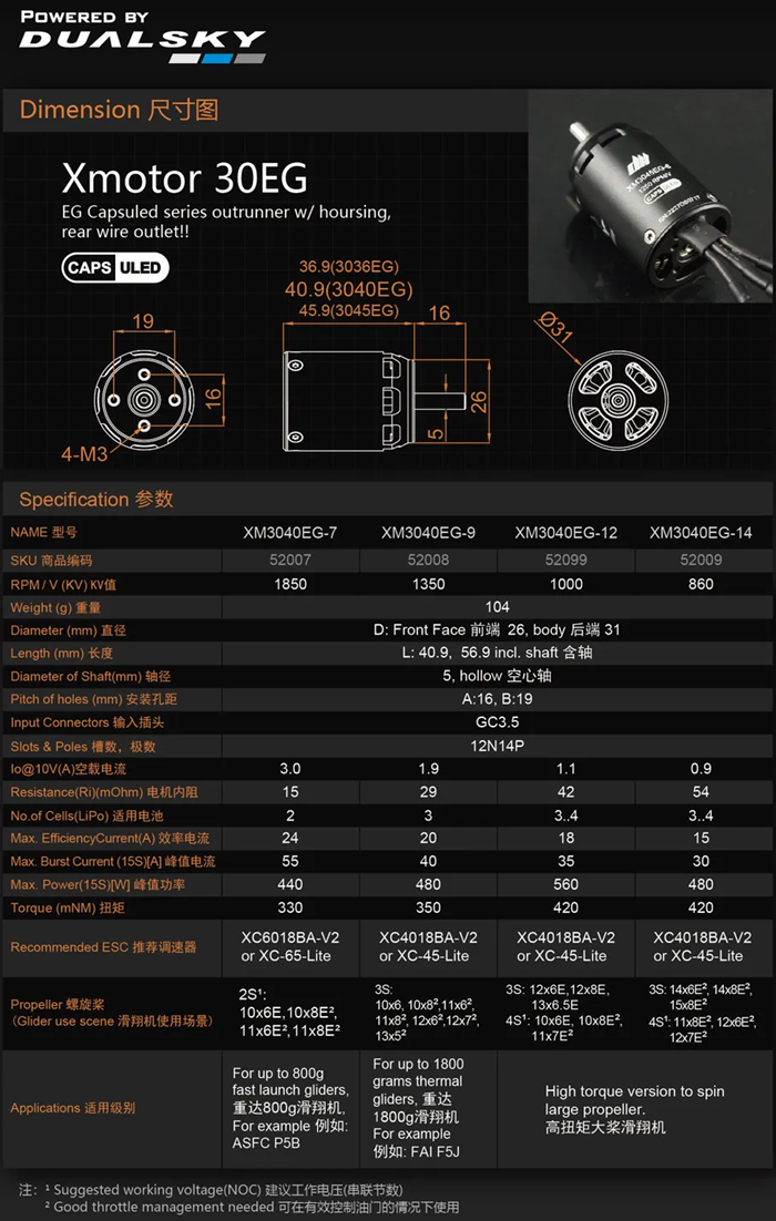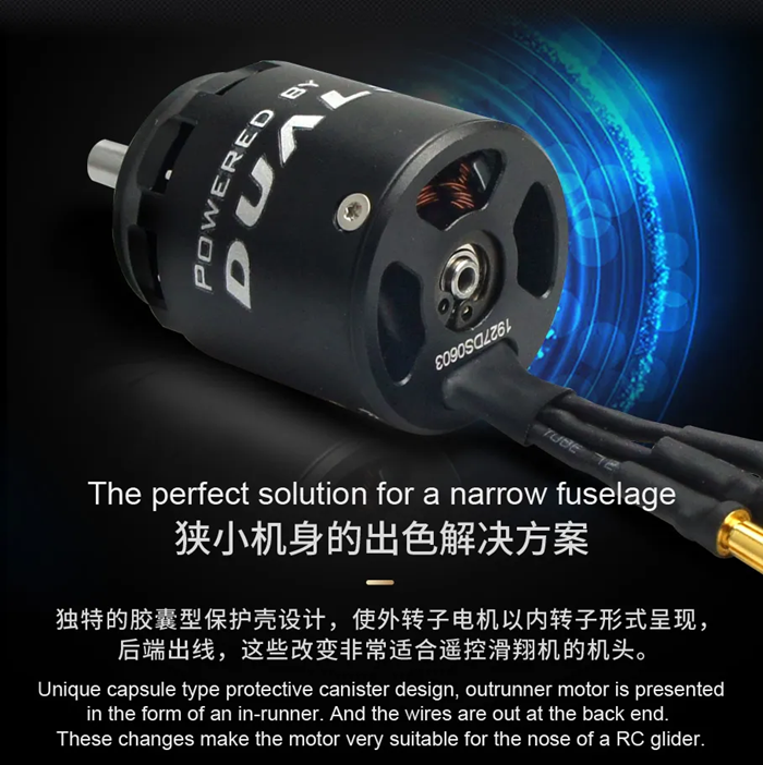 The Dualsky XM series motors are high-performance brushless outrunner motors designed specifically for RC aircraft and drones. These motors are known for their precision engineering, providing excellent power-to-weight ratios, efficiency, and durability. The XM series features a variety of sizes and KV ratings, allowing users to select the ideal motor for their specific application, whether it's for lightweight indoor flyers, high-speed racing drones, or larger, more powerful aircraft. With robust construction and advanced cooling designs, the Dualsky XM motors are trusted for their consistent performance and reliability in demanding conditions.
