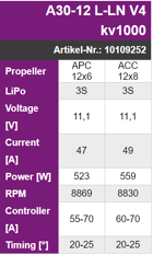 This weight-optimized high-end engine with a weight of only 159g is often used in glider models up to 2.5kg. Of course, the A30-12 L-LN V4 kv1000 also fits perfectly in motor and sports aircraft up to approx. 1.4Kg take-off weight when it gets tight under the cowling.