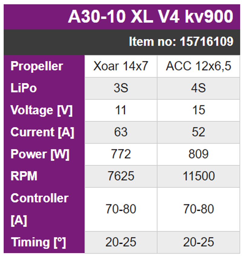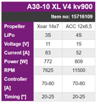 This small and lightweight outrunner is offered in four lengths (S, M, L, XL). The A30 motors, are perfect for operation on 3S or 4S LiPo batteries. The A30-V4 series comes with an optimized integrated fan and high quality ball bearings. This increases efficiency, stability and increases the range of use. The perfect drive in motor models, electric gliders, paragliders and 3D models.