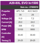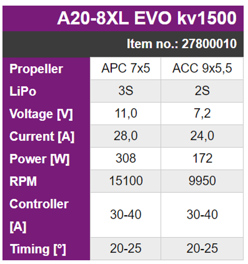 The 8, 10 and 14-pole outrunner motors of the A20 series are available in 4 lengths (S, M, L, XL), with a voltage range of 7.2V to 12.6V. As a result, they cover a wide range of applications from the 250g indoor model up to the 1.5kg electric glider. The A20 series has double ball bearings, has a replaceable 3mm shaft and can be mounted both in front of and behind the head frame/engine mount.