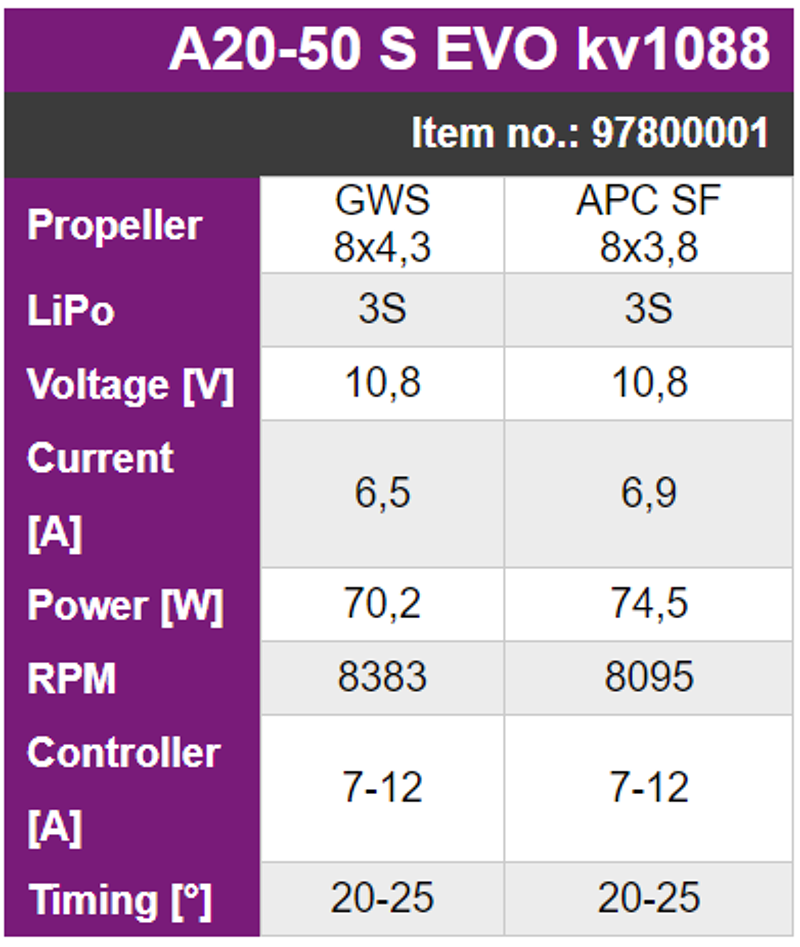 The weight-optimised high-end motor A20-50 S EVO kv1088 with a weight of only 29g is ideal for indoor 3D models up to 250g