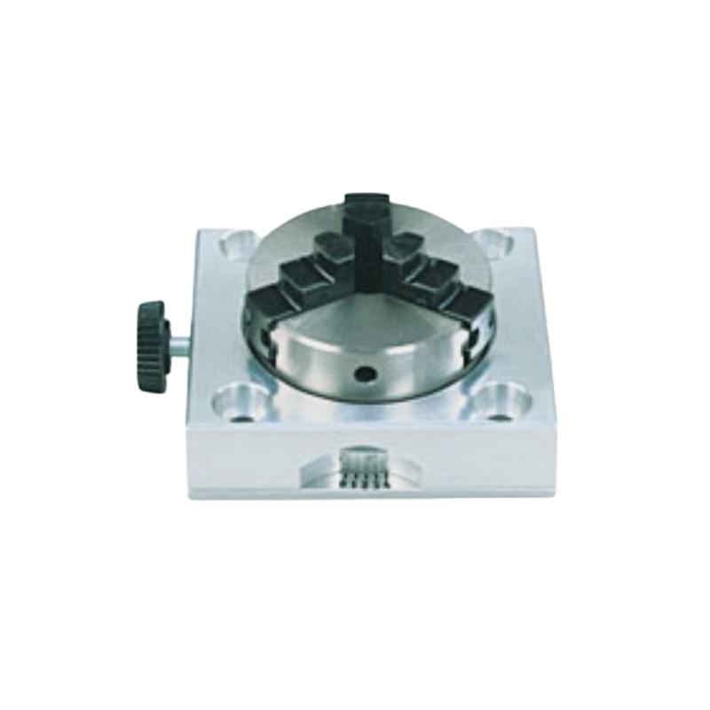 For machining circular workpieces, drilling and milling offset on the radial axis, surface milling of keys, square and hexagonal profiles, etc. Scale accurate to the degree with vernier mounted on the base body. Chuck with reversible jaws: internal clamping range from 1.5 to 32 mm, external from 12 to 65 mm. Chuck passage 11 mm (for machining long shafts in vertical position). With mounting holes for horizontal and vertical mounting, as well as suitable slides and mounting screws for mounting on the MICRO-milling machine MF 70 and the MICRO-coordinate table KT 70. Size 72 x 64 x 38 mm. In wooden case with sliding lid.