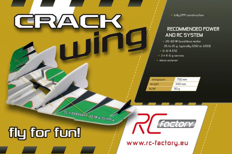 Crack Wing is 3D capable combat indoor/outdoor wing, ready for fast-paced aerobatics, fun combat, and spur of the moment flying with minimal investment. The Crack Wing's huge fins make for exceptional stability in low speeds, as well as easy and exciting vertical take-offs from any surface. The low weight and durable full EPP construction make this airplane perform great while remaining incredibly durable, all without breaking the bank. The Crack Wing boasts a wide speed range and quick construction, making it an ideal spec combat plane or just a bunch of no-frills fun for pilots of any skill level. Available in several color schemes. Developed in collaboration with Twisted Hobbys.